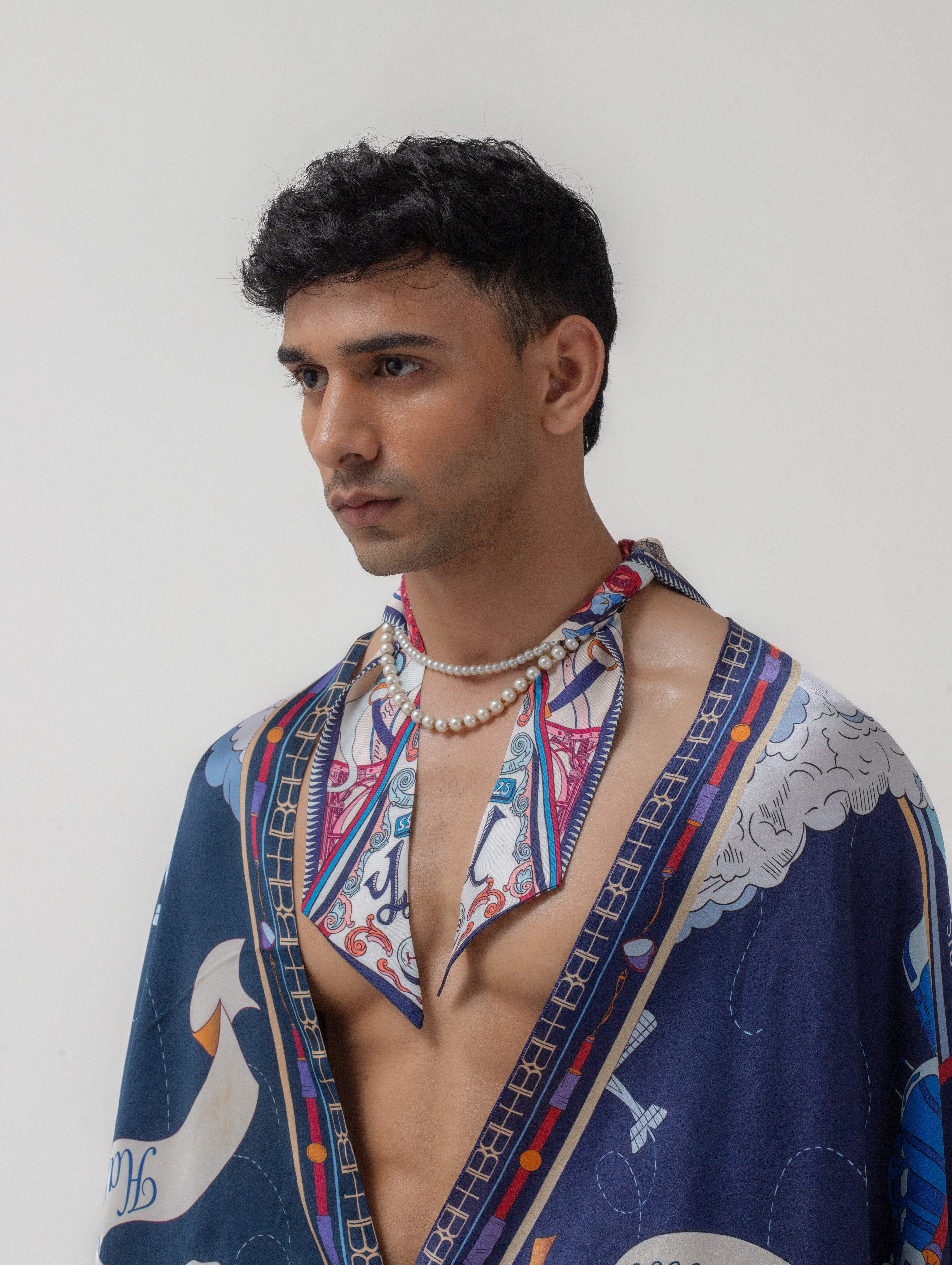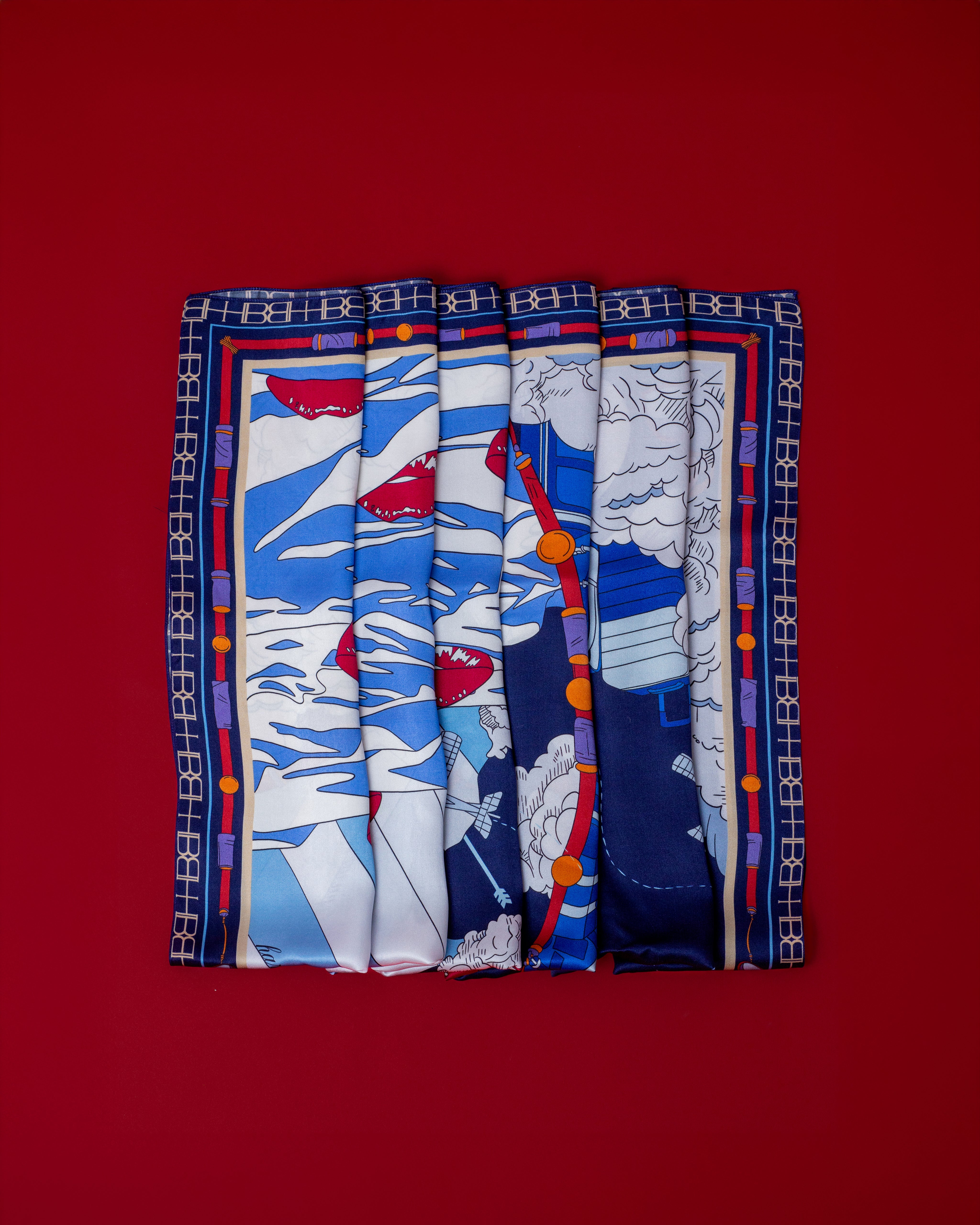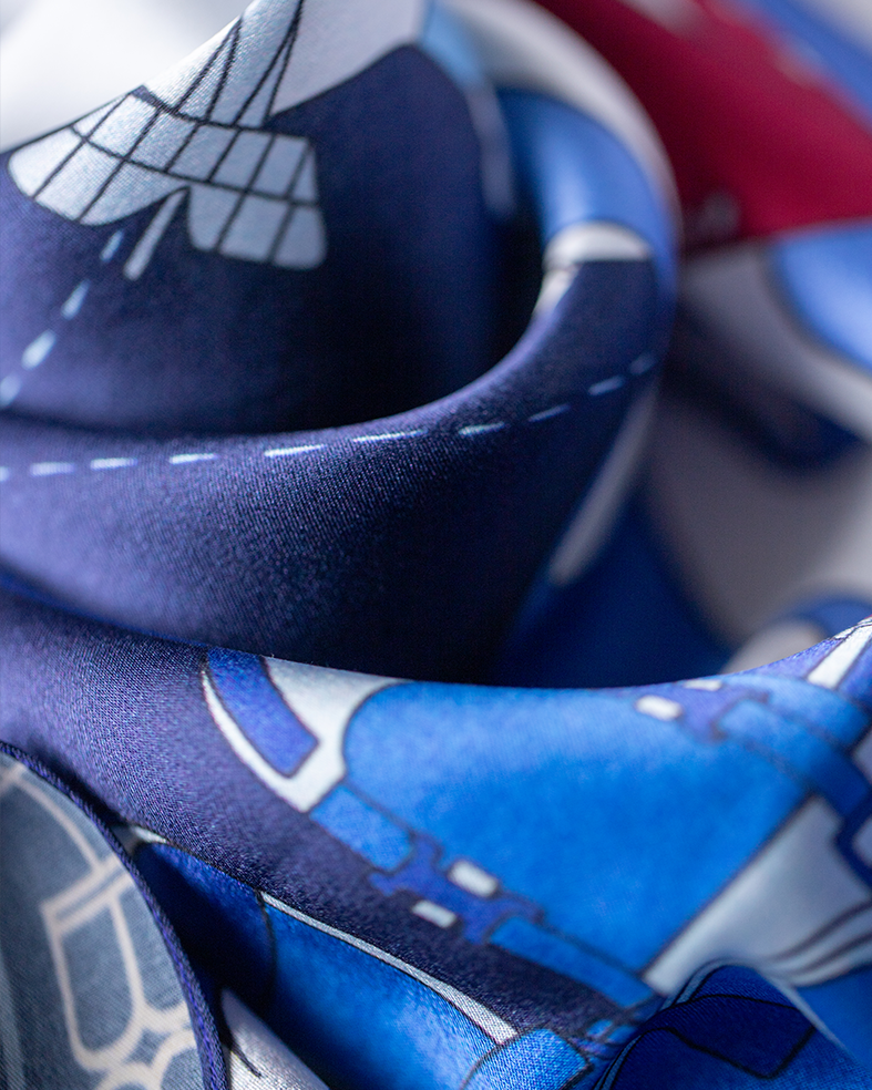 Every scarf is meticulously hand-drawn, ensuring precise detailing and vibrant colours. Each element is purposefully chosen to enhance the narrative and beauty of the design.